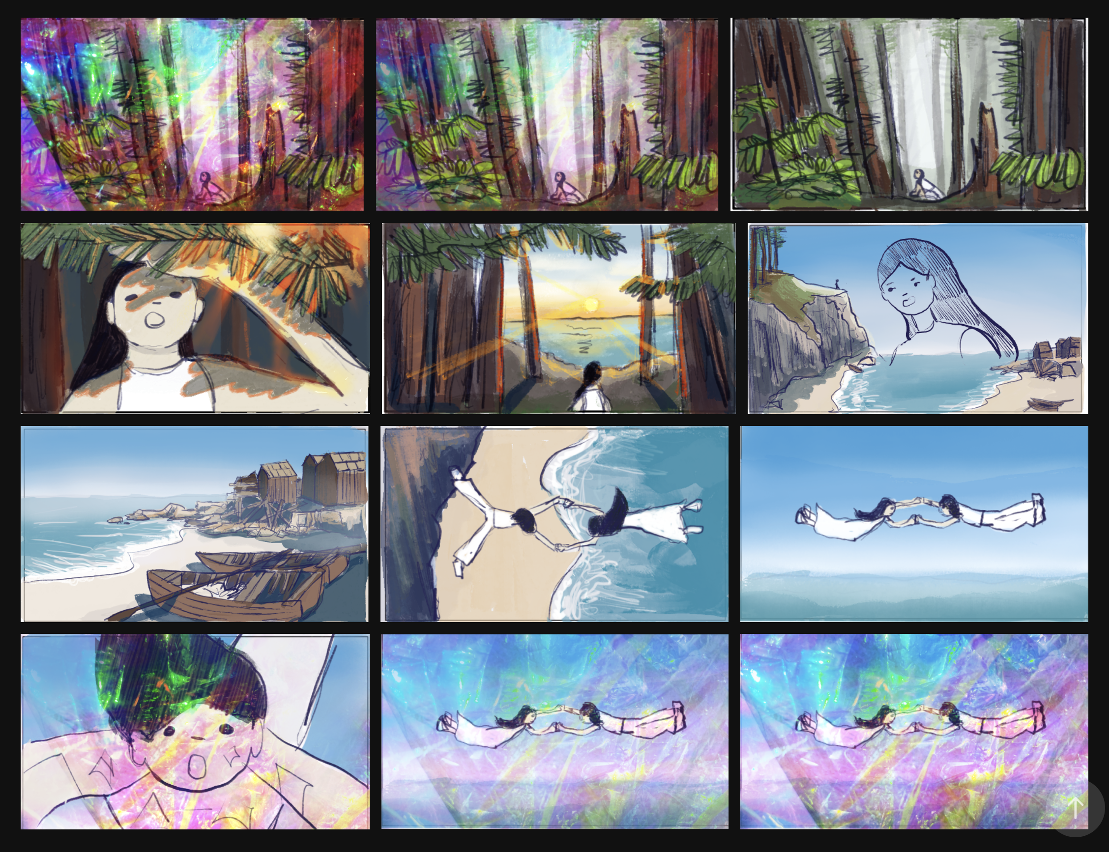 Then, I sketched out the scenes of the storyboard and positioned them on the color gradient. I used the gradient as reference to color the scenes for the color key.